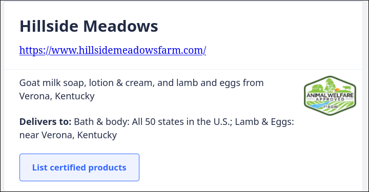 Find Humane has now added Hillside Meadows and its 31 products to the Delivery Services list. They deliver goat milk products to all 50 states in the U.S., and lamb & eggs near Verona, Kentucky or by pickup from the farm.