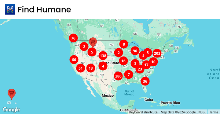 Find Humane has over 30,000 locations that may carry at least one more humanely raised animal-based product matching our default filter and over 3,000 unique such products.